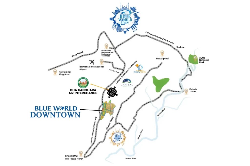 Blue World City’s Downtown location is highly accessible. It has a location advantage over major locations. They contain the New Islamabad International Airport. There are also developing areas of Rawalpindi that are close to the location. M2 Lahore Islamabad Motorway is in proximity.